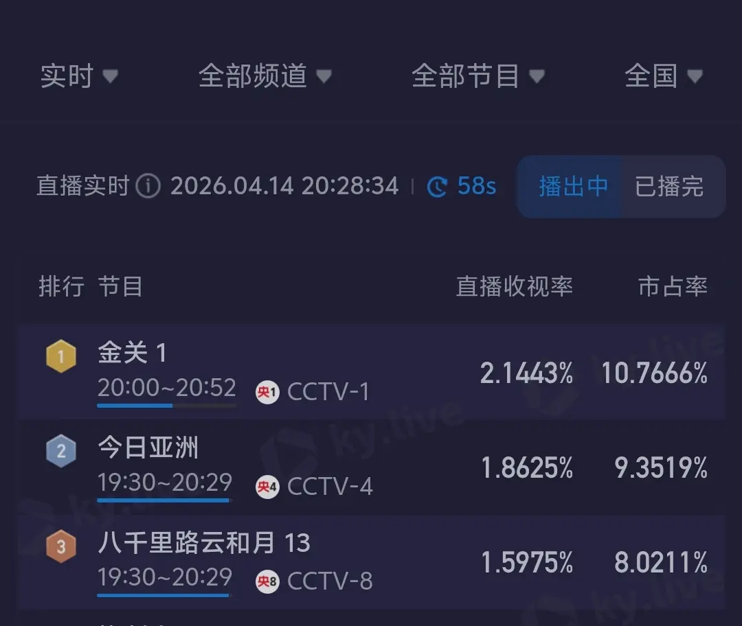 可就是这么一部没有存在感的剧,刚开播就猝不及防的“放大”收视率像坐了火箭,不到半个小时就破了2.1超过央视八套正在热播的《八千里路云和月》飙升到了第一名